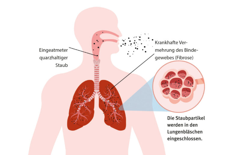 Silikose ist eine chronische Lungenerkrankung, die durch das Einatmen von feinem quarzhaltigem Staub entsteht. Feine Staubpartikel gelangen bis in die Lungenbläschen (Alveolen) und verursachen dort eine krankhafte Vermehrung des Bindegewebes mit Vernarbungen. Diese führt zu einer verminderten Elastizität der Lunge und beeinträchtigt die Atemfunktion sowie den Lungenkreislauf. Die Krankheit kann auch nach dem Ende der Tätigkeit mit Quarzstaubbelastung fortschreiten oder erst später ausbrechen. Typische Symptome sind Atemnot sowie Husten mit Auswurf. Besonders gefährdet sind Menschen mit Quarzstaubbelastung, die in der Steinverarbeitung, Mineralgewinnung oder der keramischen Industrie arbeiten.