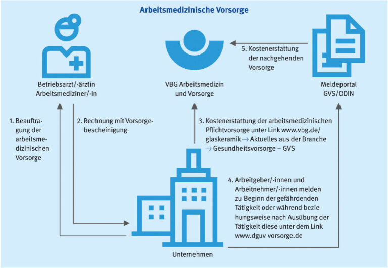 Die arbeitsmedizinische Vorsorge hilft, arbeitsbedingte Erkrankungen und Berufskrankheiten vorzubeugen oder zu verhindern. Unternehmen sind dazu verpflichtet, die Vorsorge zu organisieren sowie die Vorsorgedaten ihrer Beschäftigten zu speichern und zu verwalten. Für die Pflichtvorsorge bei Tätigkeiten mit quarzhaltigem Staub können Mitgliedsunternehmen der Branche Glas und Keramik die entstandenen Kosten bei der VBG einreichen. Die nachgehende Vorsorge, die auch nach dem Ende des Beschäftigungsverhältnisses anzubieten ist, können Unternehmen auf die VBG beziehungsweise auf die Gesundheitsvorsorge (GVS) übertragen.